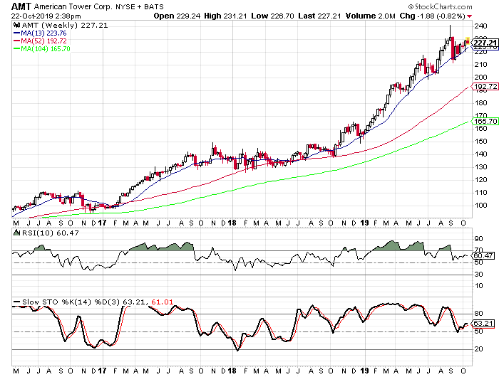 Looking at the weekly chart for American Tower we see that the stock has been trading above its 13-week moving average since last October. That is an impressive run, especially considering the volatility we have seen in the overall market for the past year.