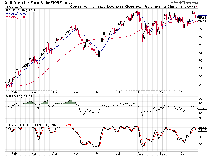 On October 17, the daily stochastic readings for the XLK made a bearish crossover as the indicators were in overbought territory. The fund did fall on October 18, but of course the overall market dropped significantly that day as well.