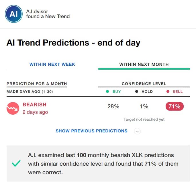 The XLK also saw a bearish signal generated from the Tickeron Trend Prediction Engine on October 18. The signal calls for a decline of at least 4% within the next month and it showed a confidence level of 71%. Past predictions for the fund have been successful 71% of the time.