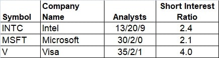 Turning our attention to the sentiment towards these three stocks, you would expect the indicators to show a bullish skew simply because the companies have performed well and the stocks have all performed above average in terms of price performance. The one stock that does have some bearish sentiment directed toward it is Intel. The analysts are rather skeptical of the stock with only 13 out of 42 analysts ranking it as a “buy”. The buy percentage is only 31% and that is well below average.