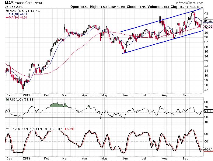 Masco is set to announce earnings again on October 30. The report will be worth keeping an eye on as it was earnings that created the big gap higher in July and the big gap lower in April.
