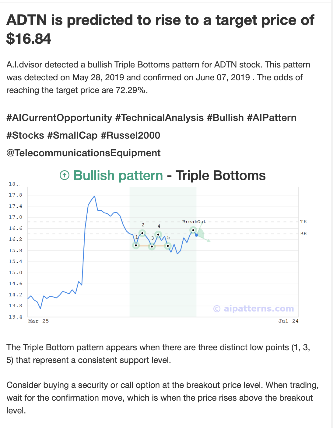 ADTN may jump back above the lower band and head toward the middle band. Traders may consider buying the stock or exploring call options. In of 42 cases where ADTN's price broke its lower Bollinger Band, its price rose further in the following month. The odds of a continued upward trend are .