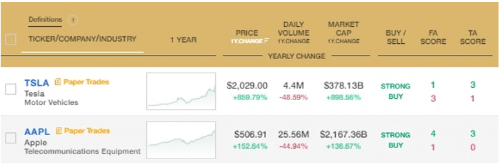 If we look at the Tickeron scorecards for Apple and Tesla, both companies get a “strong buy” rating. These ratings are based primarily on technical analysis factors and both have three bullish signals on that side of the equation. Tesla has one bearish signal while Apple doesn’t have any bearish technical indicators.