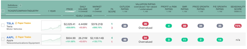 Looking at the fundamental analysis screener, the only negative mark for Apple is the Valuation Rating, meaning that the company is likely overvalued at this time. For Tesla it gets a score of 99 in the Valuation Rating. That is the worst possible score a stock can get. The company also gets a score of 99 in the SMR Rating category and once again that is the worst possible score. The other negative mark comes in the Seasonality Score where it shows a 75% chance of a decline.