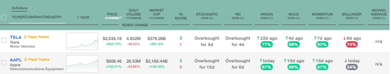 On the technical analysis screener, the one negative indicator for Tesla is the Bollinger Bands. The stock moved above the upper band early last week. We also see that both Apple and Tesla have been overbought for a number of days based on their stochastic indicators and the RSI.