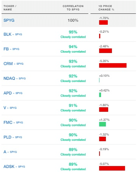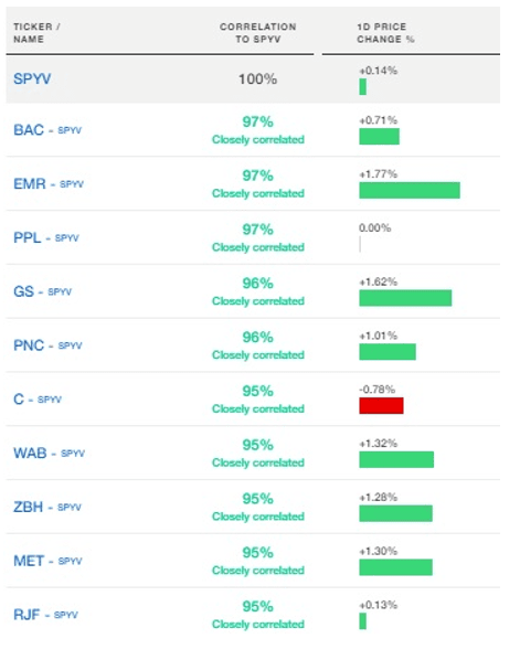 The opposite was true for the stocks most closely correlated to the SPYV. Eight of the 10 most highly correlated gained ground, one was unchanged, and one fell. Five of the 10 gained more than 1.0% on a day when the S&P itself was down almost 1.0%.