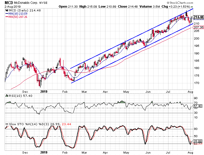 MCD in Uptrend: price expected to rise as it breaks its lower Bollinger Band on July 31, 2019.