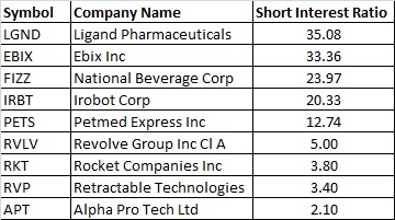 While I arrived at this list of stocks due to the short interest as a percentage of the float, there is another indicator that I like to look at as well and that is the short interest ratio. This indicator measures the number of shares sold short divided by the average daily trading volume. What this tells us is how long it will take short sellers to cover their positions based on the average daily volume.