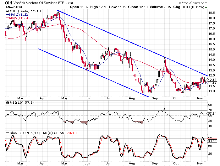 Most of the big oil services companies have reported earnings already for the third quarter. The sector has been trending higher over the last month as those earnings reports have been released, but many of the stocks are now in overbought territory based on their daily stochastic readings. On November 7, four of top six holdings in the VanEck Vectors Oil Services ETF (NYSE: OIH) appeared on a bearish scan that I run each night. One of the factors in the scan is a bearish crossover from the stochastics and that the readings are at or near overbought territory.