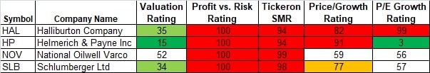 The only ratings that are positive are the Valuation ratings for Helmerich & Payne, Halliburton, and Schlumberger. The highest rating in any category for all of the ratings is the P/E Growth rating for Helmerich & Payne.