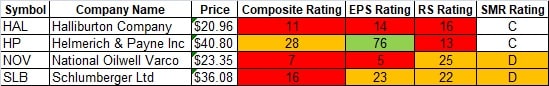 I also ran the stocks through Investor’s Business Daily’s ratings system and what came out was more of the same—lots of poor readings and only one really positive reading. The lone rating in the top quartile was Helmerich & Payne’s EPS rating at 76. The SMR ratings for Halliburton and Helmerich & Payne are average. All of the other readings are below average with many of them being in the bottom 20% – those are designated with the red highlights.
