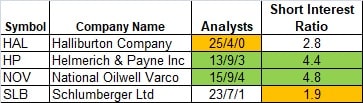 As for the short interest ratios for these four companies, Schlumberger’s is low at 1.9 and that is a concern. Halliburton’s ratio is in the average range and Helmerich & Payne and National Oilwell Varco have short interest ratios that are slightly higher than average. Again that is a positive sign that the ratios are above average.