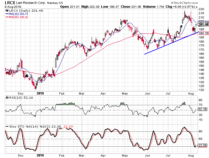 Since the low at the beginning of June, semiconductor manufacturer Lam Research (Nasdaq: LRCX) has been trending higher and a trend line connects the stock's lows over the last two months. The stock hit the trend line earlier this week and has bounced since then.