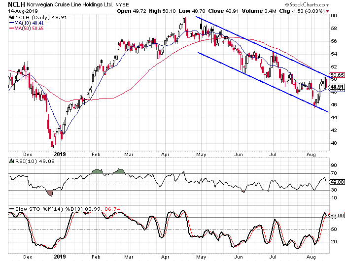 Over the last three and a half months, Norwegian Cruise Line Holdings (NYSE: NCLH) has been struggling a bit, or at least its stock has. After peaking in early May, the stock has underperformed the overall market and a trend channel has formed that defines the various cycles within the overall trend. The stock hit the upper rail of the channel on August 13 before turning lower the next day. The downward momentum has been strong enough that the 50-day moving average crossed bearishly below the 200-day in early August.