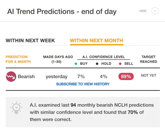 Moving lower for three straight days is viewed as a bearish sign. Keep an eye on this stock for future declines. Considering data from situations where NCLH declined for three days, in of 311 cases, the price declined further within the following month. The odds of a continued downward trend are .
