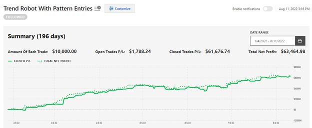 This robot trades large cap stocks available to every broker and has made 72% annualized P/L without big drawdowns since the beginning of 2022. The average duration of a trade is 4 days, which makes it easy to follow the signals generated by the robot.