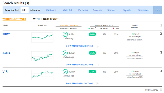 Tickeron's End-of-Day Trend Prediction Engine will instantly generate AI-driven projections on whether a stock is going up or down for the next week or month. The algorithm looks at past price changes and generates unique insights into future fluctuations. TPE analyzes trends for stocks, penny stocks, ETFs, mutual funds, cryptocurrencies, and Forex. To make this tool more convenient, it’s best to customize it by adjusting the confidence level, price range, asset classes, and many others. You can also set up notifications for emails or push notifications.