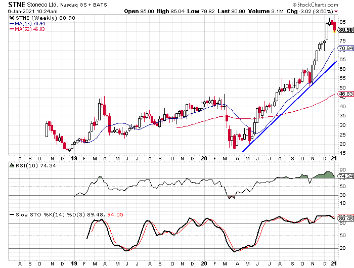 I can exercise patience and wait to see if the stock pulls back, or in some cases I can write puts on the stock and see if the stock drops down to what I see as a support level. In some cases, it doesn’t make sense to write the puts because the reward for making the trade doesn’t outweigh the risk. One stock that hit my radar in the last few days that I believe it makes sense to write puts on is Stoneco Ltd. (STNE). The fintech software company has rallied sharply since May, but it is tremendously overbought.