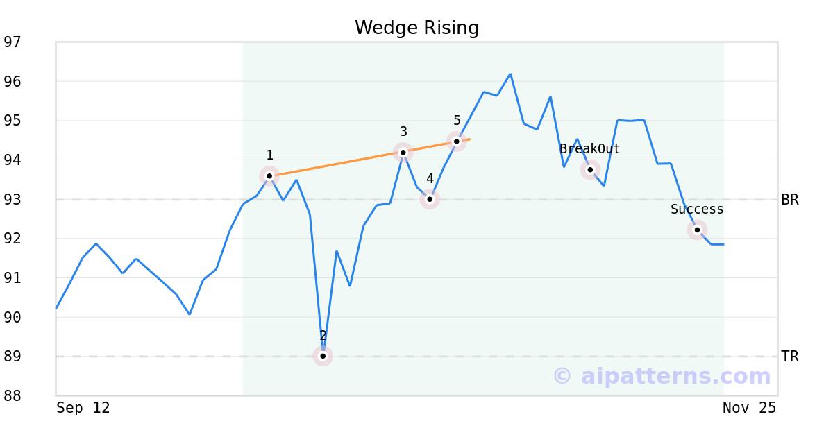 On October 24, 2025, A.I.dvisor detected a Wedge Rising Pattern (Bearish) for iShares MSCI All Country Asia ex Jpn ETF (AAXJ, $94.46). 13 days later, on November 06, 2025, A.I.dvisor confirmed the Bearish pattern, setting a target price of the stock. On November 18, 2025, the stock hit the target price of $89.00 – resulting in a gain for traders who shorted the stock on the pattern detection date.
