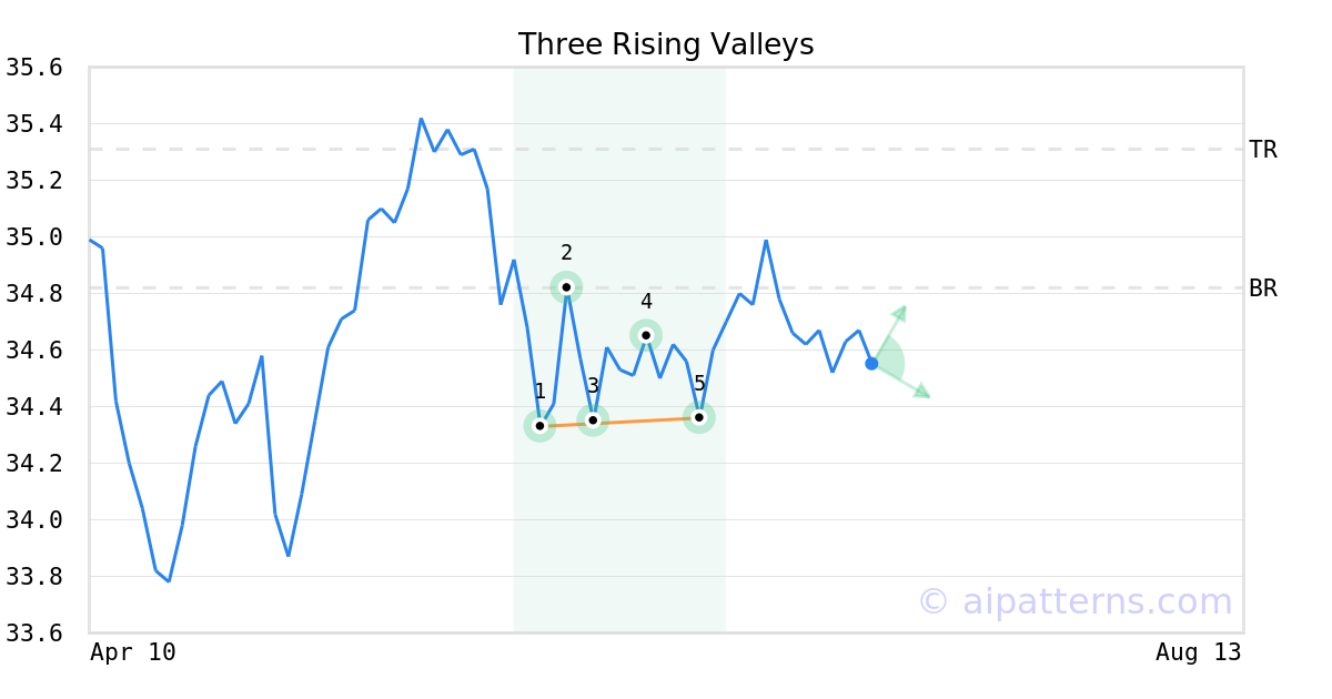 A.I.dvisor detected a bullish Three Rising Valleys pattern for ACGCX stock. This pattern was detected on June 14, 2024 . The odds of reaching the target price are . The Three Rising Valleys pattern forms when three minor Lows (1, 3, 5) are arranged along an upward sloping trend line. Consider buying a security or call option at the breakout price level. When trading, wait for the confirmation move, which is when the price rises above the breakout level.
