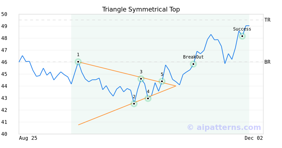 On October 22, 2025, A.I.dvisor detected a Triangle Symmetrical Top Pattern (Bullish) for ACNB Corp (ACNB, $44.39). On November 04, 2025, A.I.dvisor confirmed the Bullish pattern, setting a target price of $49.52. 20 days later, on November 24, 2025, ACNB reached the target price resulting in a for traders who took a long position in the stock.