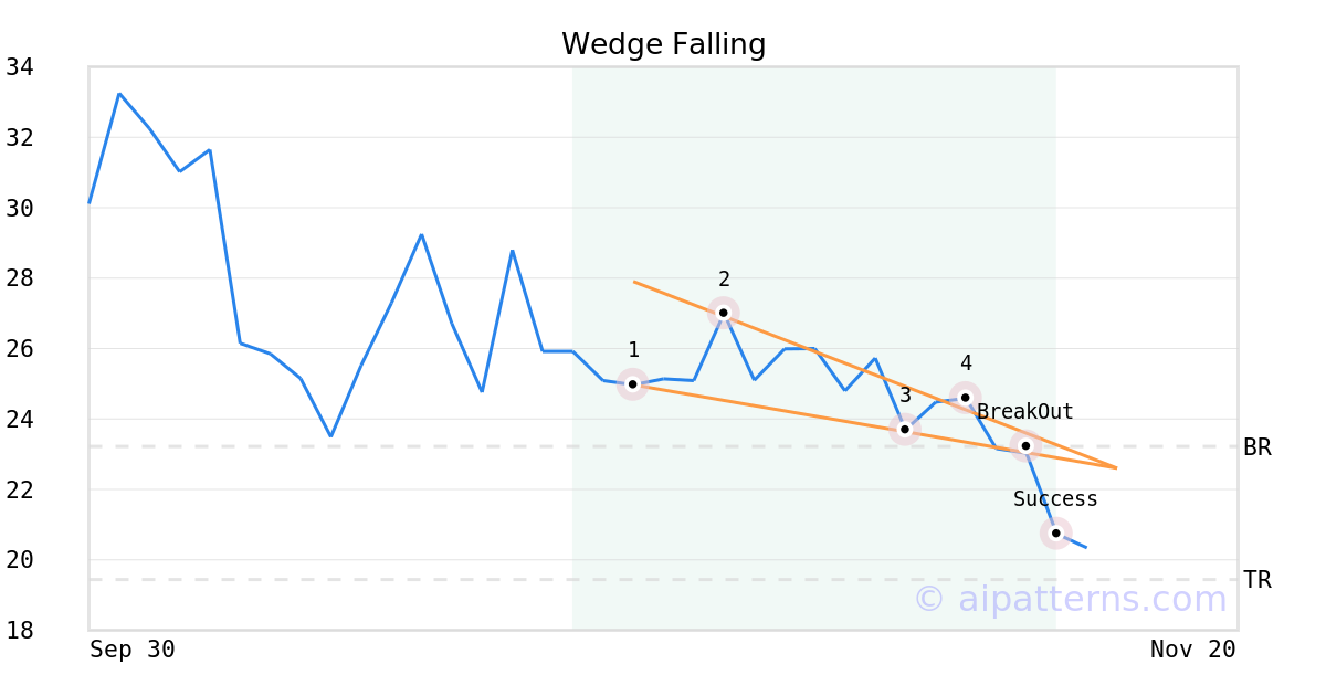 On November 12, 2025, A.I.dvisor detected a Wedge Falling Pattern (Bearish) for Aehr Test Systems (AEHR, $23.22). On November 12, 2025, A.I.dvisor confirmed the Bearish pattern, setting a target price of the stock. On November 13, 2025, the stock hit the target price of $19.44 – resulting in a +1 gain for traders who shorted the stock on the pattern detection date.