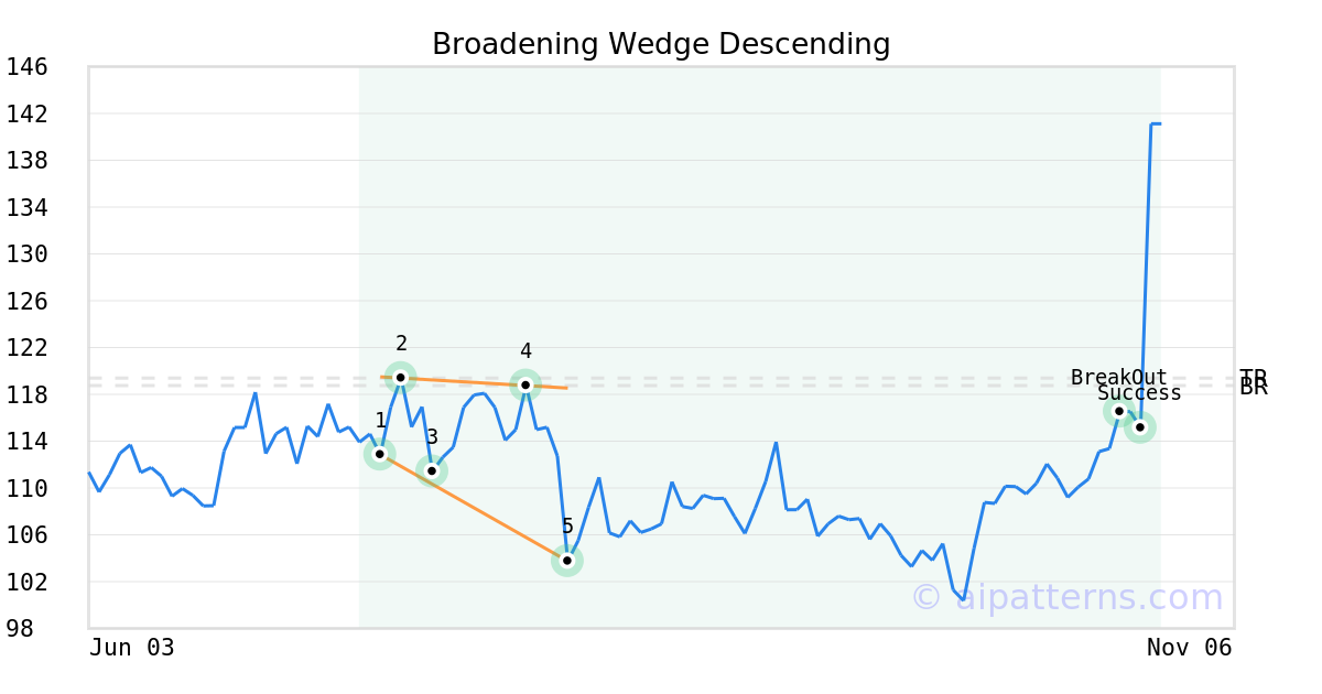 On August 08, 2025, A.I.dvisor detected a Broadening Wedge Descending Pattern (Bullish) for Agilysys (AGYS, $103.75). On October 23, 2025, A.I.dvisor confirmed the Bullish pattern, setting a target price of $119.39. 4 days later, on October 27, 2025, AGYS reached the target price resulting in a +1 for traders who took a long position in the stock.