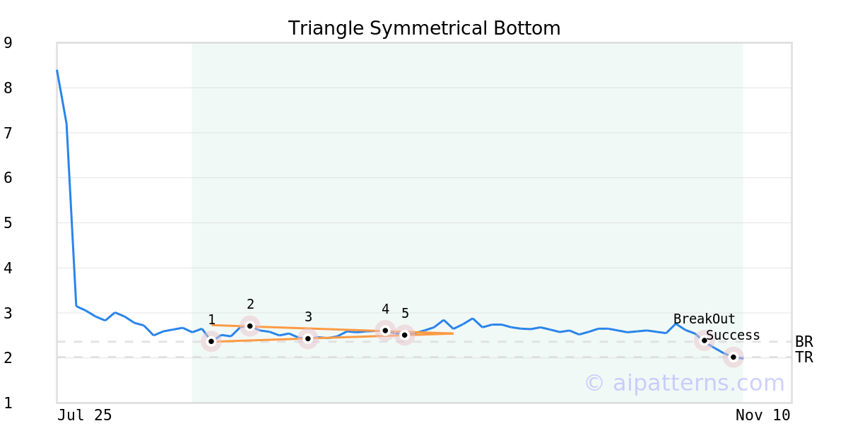 On September 16, 2025, A.I.dvisor detected a Triangle Symmetrical Bottom Pattern (Bearish) for AIM ImmunoTech Inc (AIM, $2.50). 43 days later, on October 29, 2025, A.I.dvisor confirmed the Bearish pattern, setting a target price of the stock. On November 03, 2025, the stock hit the target price of $2.02 – resulting in a +1 gain for traders who shorted the stock on the pattern detection date.