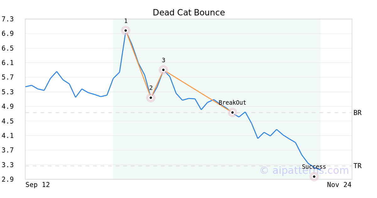 On October 29, 2025, A.I.dvisor detected a Dead Cat Bounce Pattern (Bearish) for Airship AI Holdings (AISP, $4.73). On October 29, 2025, A.I.dvisor confirmed the Bearish pattern, setting a target price of the stock. On November 17, 2025, the stock hit the target price of $3.27 – resulting in a +3 gain for traders who shorted the stock on the pattern detection date.