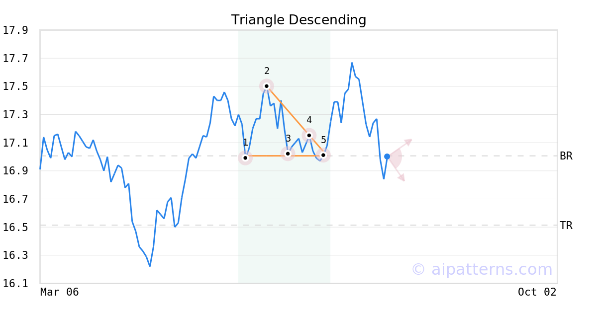A.I.dvisor detected a bearish Triangle Descending pattern for AIVBX stock. This pattern was detected on July 01, 2024 . The odds of reaching the target price are 6. The Descending Triangle pattern has a horizontal bottom (1, 3, 5) which represents the support level, and a down-sloping top line (2, 4). Consider selling the security short or buying a put option at the downward breakout price level. When trading, wait for the confirmation move, which is when the price falls below the breakout level.