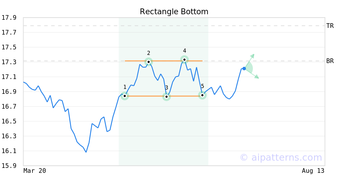 Two horizontal lines (1, 3, 5) and (2, 4) form the Rectangle Bottom Pattern as the security bounces up and down between support and resistance levels.