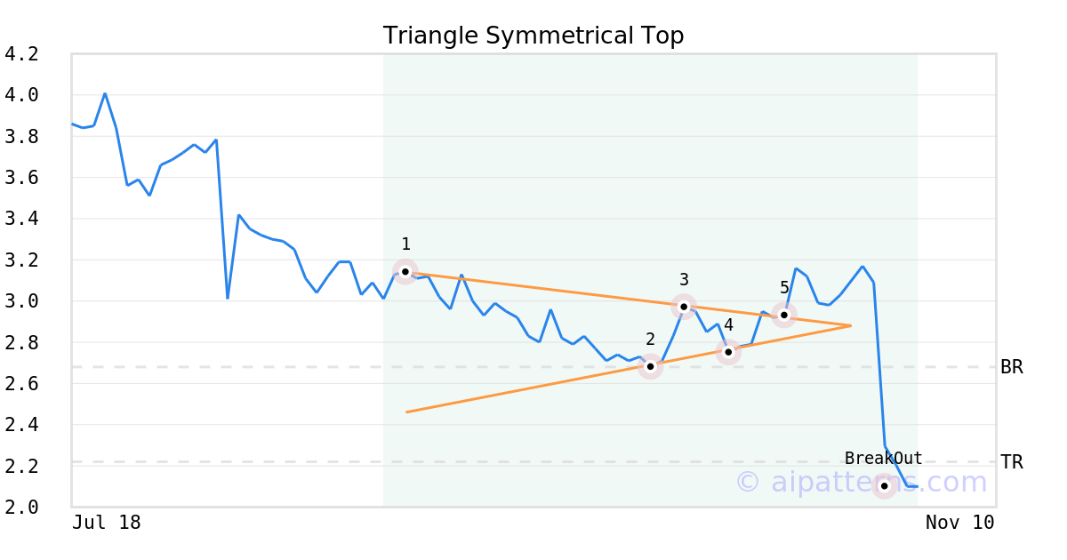 On October 17, 2025, A.I.dvisor detected a Triangle Symmetrical Top Pattern (Bearish) for Akebia Therapeutics (AKBA, $2.93). 12 days later, on October 29, 2025, A.I.dvisor confirmed the Bearish pattern, setting a target price of the stock. On October 29, 2025, the stock hit the target price of $2.22 – resulting in a +2 gain for traders who shorted the stock on the pattern detection date.