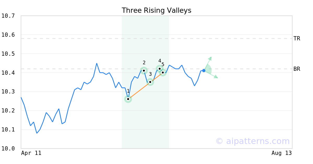 The Three Rising Valleys pattern forms when three minor Lows (1, 3, 5) are arranged along an upward sloping trend line.