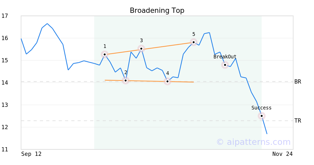 On October 29, 2025, A.I.dvisor detected a Broadening Top Pattern (Bearish) for Alarum Technologies Ltd (ALAR, $15.81). 8 days later, on November 06, 2025, A.I.dvisor confirmed the Bearish pattern, setting a target price of the stock. On November 17, 2025, the stock hit the target price of $12.29 – resulting in a +2 gain for traders who shorted the stock on the pattern detection date.