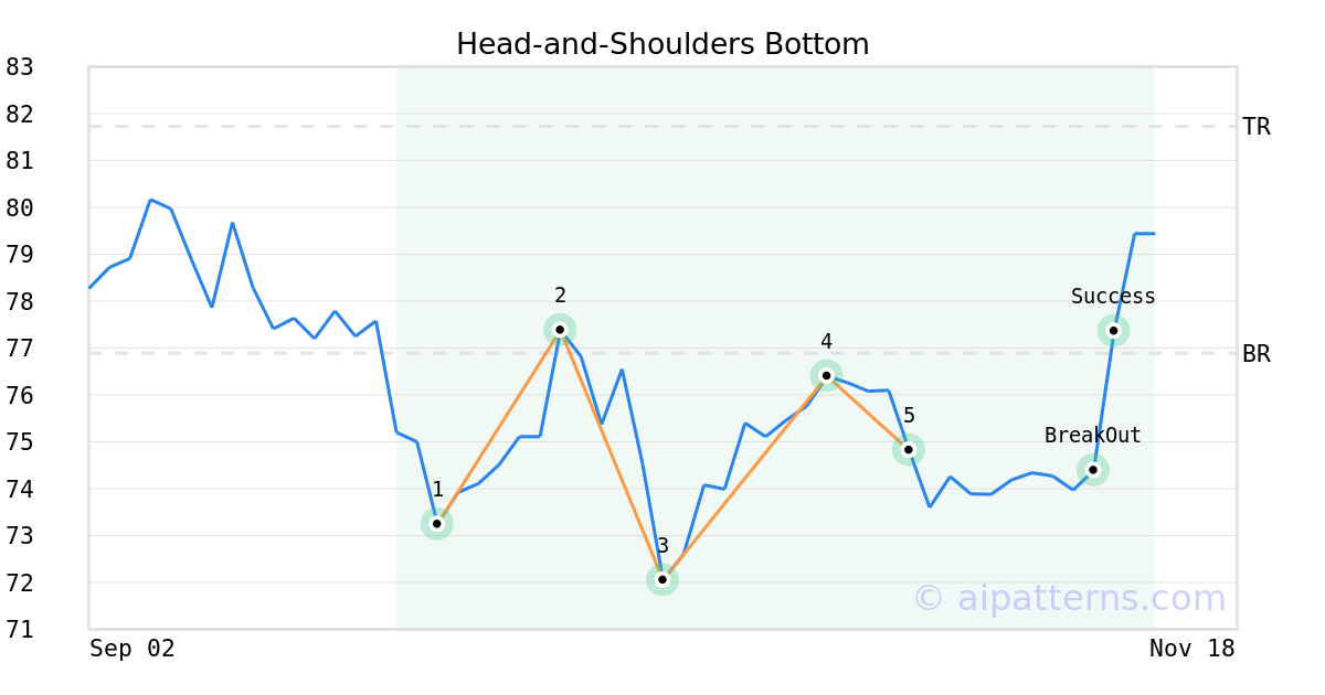 On October 28, 2025, A.I.dvisor detected a Head-and-Shoulders Bottom Pattern (Bullish) for Alcon (ALC, $74.82). On November 10, 2025, A.I.dvisor confirmed the Bullish pattern, setting a target price of $81.73. 1 day later, on November 11, 2025, ALC reached the target price resulting in a for traders who took a long position in the stock.