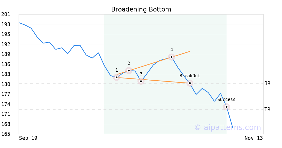 On October 29, 2025, A.I.dvisor detected a Broadening Bottom Pattern (Bearish) for Alamo Group (ALG, $180.26). On October 29, 2025, A.I.dvisor confirmed the Bearish pattern, setting a target price of the stock. On November 06, 2025, the stock hit the target price of $172.42 – resulting in a gain for traders who shorted the stock on the pattern detection date.