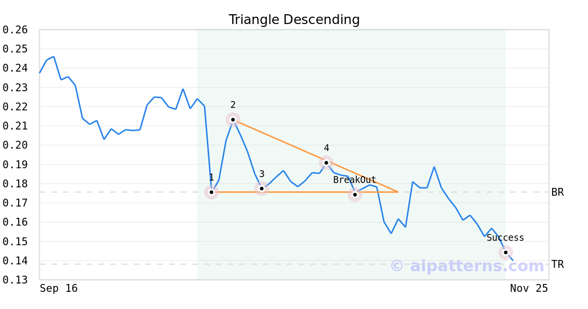 On October 30, 2025, A.I.dvisor detected a Triangle Descending Pattern (Bearish) for Algorand cryptocurrency (ALGO.X, $0.173717). On October 30, 2025, A.I.dvisor confirmed the Bearish pattern, setting a target price of the stock. On November 20, 2025, the stock hit the target price of $0.138100 – resulting in a +1 gain for traders who shorted the stock on the pattern detection date.