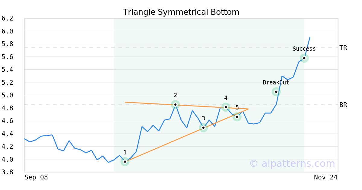 On October 30, 2025, A.I.dvisor detected a Triangle Symmetrical Bottom Pattern (Bullish) for Alumis Inc. (ALMS, $4.66). On November 10, 2025, A.I.dvisor confirmed the Bullish pattern, setting a target price of $5.74. 7 days later, on November 17, 2025, ALMS reached the target price resulting in a +1 for traders who took a long position in the stock.