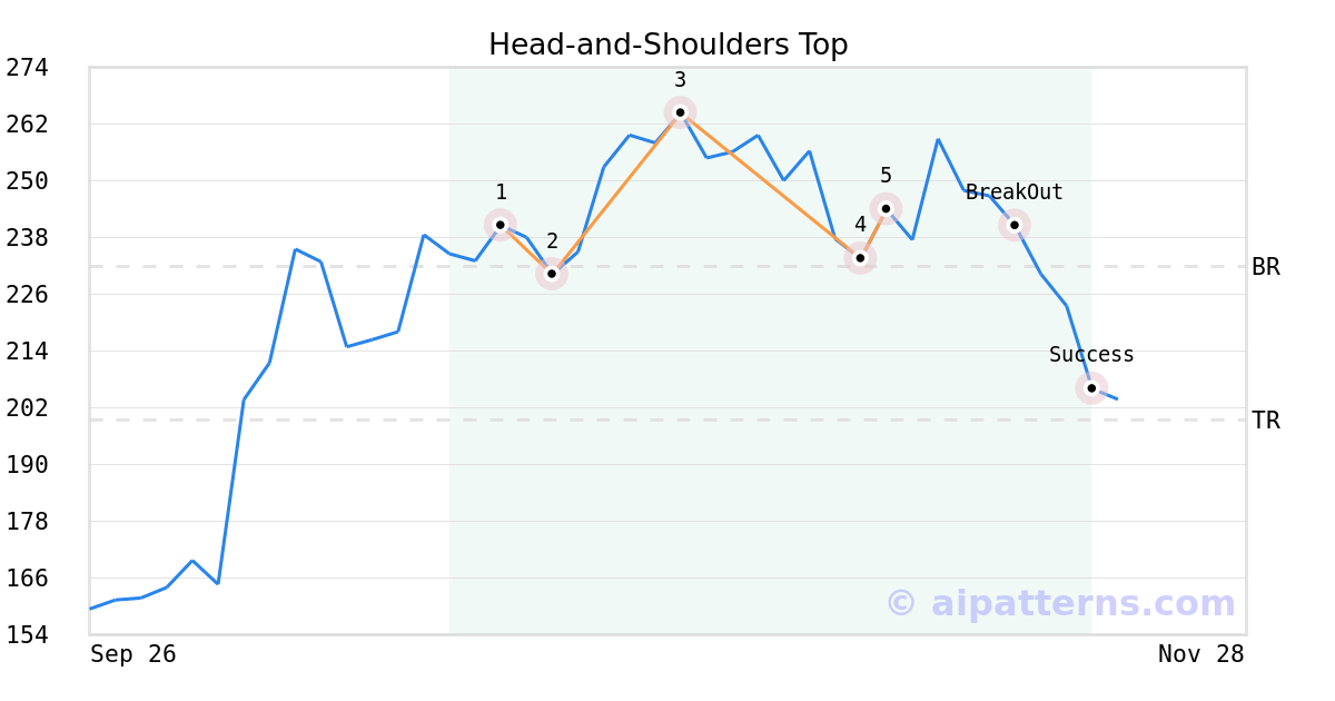 On November 10, 2025, A.I.dvisor detected a Head-and-Shoulders Top Pattern (Bearish) for Advanced Micro Devices (AMD, $243.98). 7 days later, on November 17, 2025, A.I.dvisor confirmed the Bearish pattern, setting a target price of the stock. On November 20, 2025, the stock hit the target price of $199.44 – resulting in a +1 gain for traders who shorted the stock on the pattern detection date.