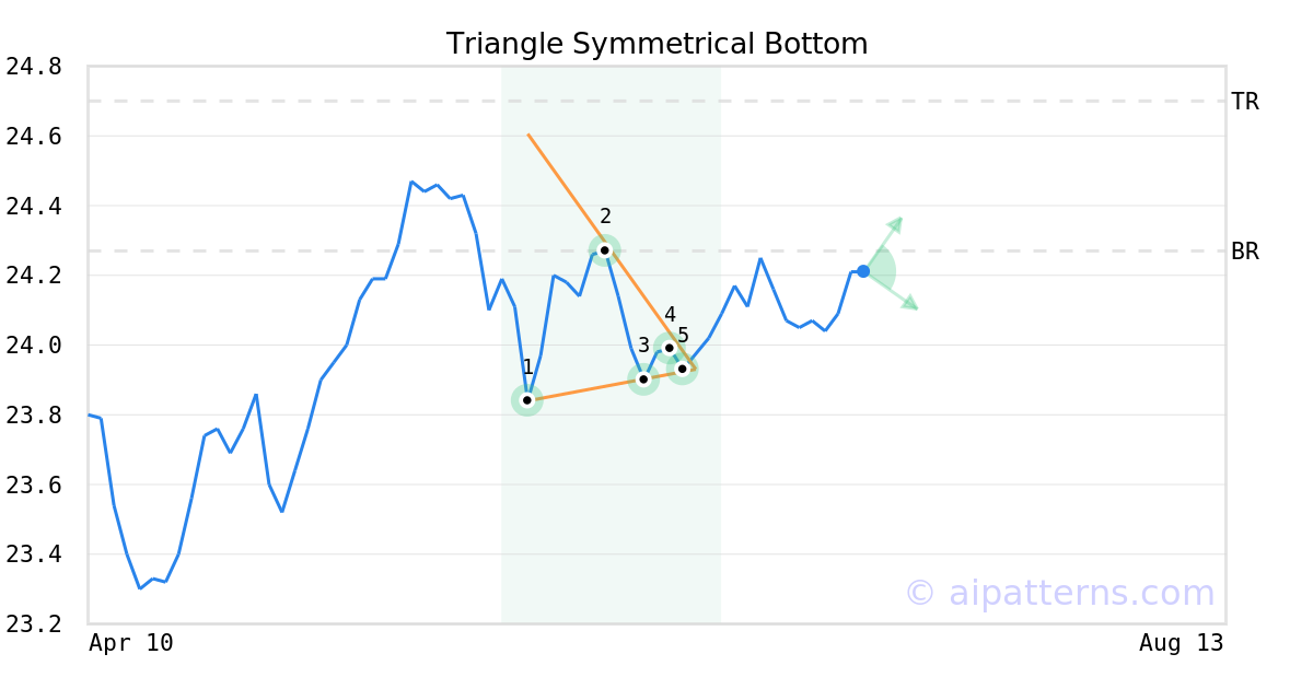 The Symmetrical Triangle Bottom pattern forms when the price of a security fails to retest a high or a low and ultimately forms two narrowing trend lines. As the support and resistance levels consolidate, they form a triangle.