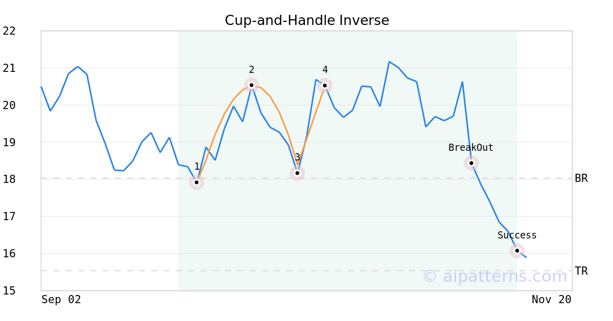 On October 15, 2025, A.I.dvisor detected a Cup-and-Handle Inverse Pattern (Bearish) for AMN Healthcare Services (AMN, $20.52). 22 days later, on November 06, 2025, A.I.dvisor confirmed the Bearish pattern, setting a target price of the stock. On November 13, 2025, the stock hit the target price of $15.54 – resulting in a +2 gain for traders who shorted the stock on the pattern detection date.
