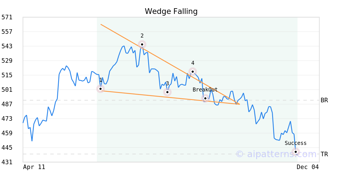 On September 08, 2025, A.I.dvisor detected a Wedge Falling Pattern (Bearish) for Ameriprise Financial (AMP, $490.73). On September 08, 2025, A.I.dvisor confirmed the Bearish pattern, setting a target price of the stock. On November 17, 2025, the stock hit the target price of $438.80 – resulting in a +1 gain for traders who shorted the stock on the pattern detection date.