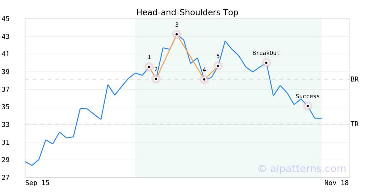 On October 23, 2025, A.I.dvisor detected a Head-and-Shoulders Top Pattern (Bearish) for Ameresco (AMRC, $39.65). 11 days later, on November 03, 2025, A.I.dvisor confirmed the Bearish pattern, setting a target price of the stock. On November 11, 2025, the stock hit the target price of $33.06 – resulting in a +1 gain for traders who shorted the stock on the pattern detection date.