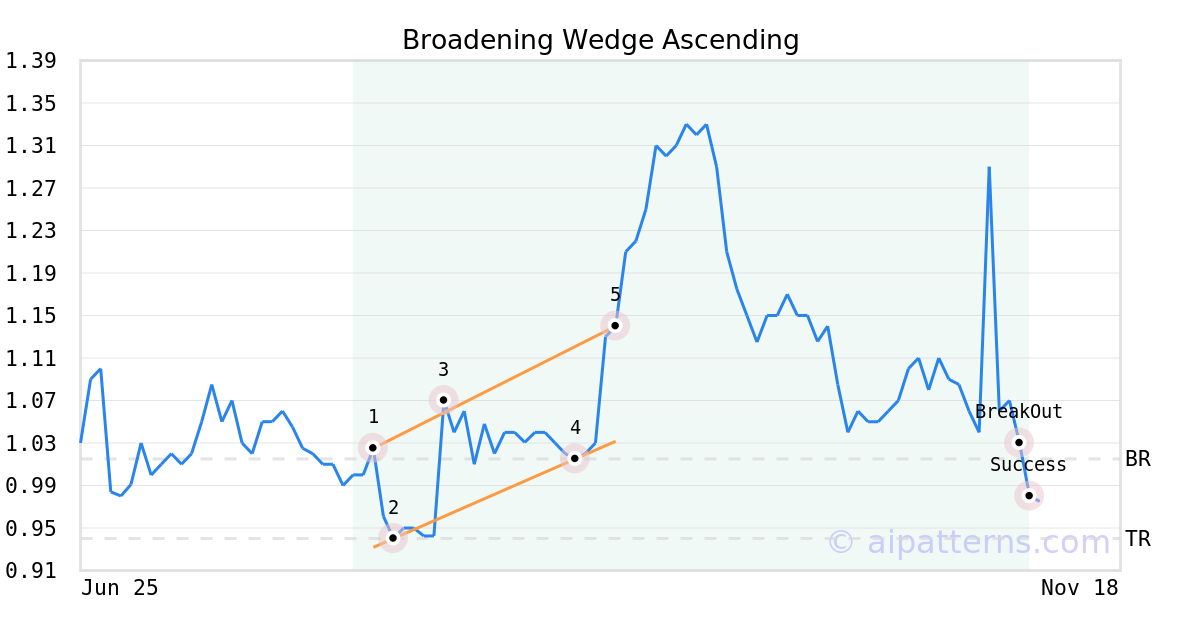 On September 10, 2025, A.I.dvisor detected a Broadening Wedge Ascending Pattern (Bearish) for AMTD IDEA Group (AMTD, $1.14). 56 days later, on November 05, 2025, A.I.dvisor confirmed the Bearish pattern, setting a target price of the stock. On November 06, 2025, the stock hit the target price of $0.94 – resulting in a +1 gain for traders who shorted the stock on the pattern detection date.