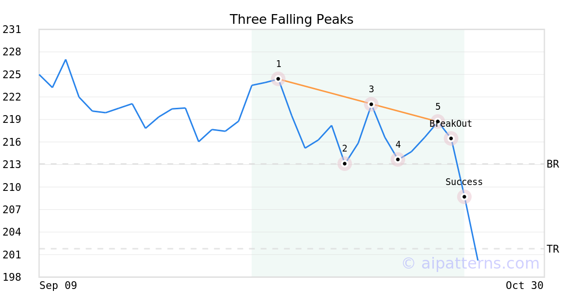On October 21, 2025, A.I.dvisor detected a Three Falling Peaks Pattern (Bearish) for AutoNation (AN, $218.70). 1 day later, on October 22, 2025, A.I.dvisor confirmed the Bearish pattern, setting a target price of the stock. On October 23, 2025, the stock hit the target price of $201.78 – resulting in a gain for traders who shorted the stock on the pattern detection date.