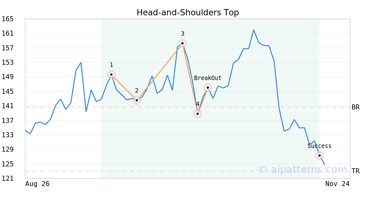 On October 16, 2025, A.I.dvisor detected a Head-and-Shoulders Top Pattern (Bearish) for Arista Networks Inc (ANET, $146.01). On October 16, 2025, A.I.dvisor confirmed the Bearish pattern, setting a target price of the stock. On November 17, 2025, the stock hit the target price of $123.06 – resulting in a +1 gain for traders who shorted the stock on the pattern detection date.