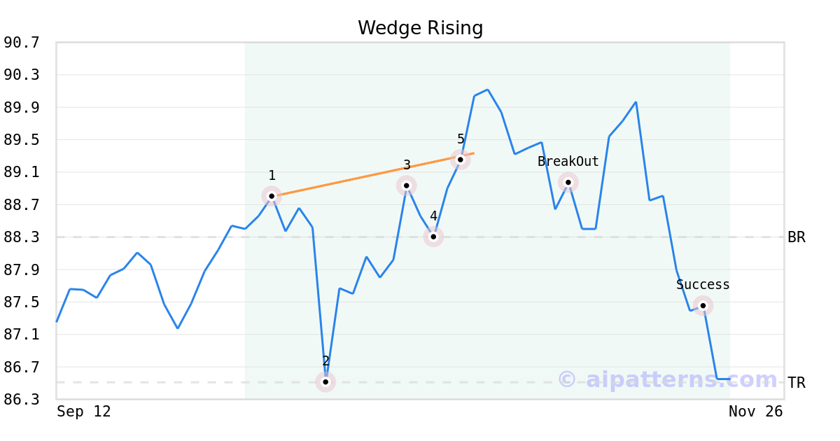 On October 24, 2025, A.I.dvisor detected a Wedge Rising Pattern (Bearish) for iShares Core 80/20 Aggressive Allc ETF (AOA, $89.25). 12 days later, on November 05, 2025, A.I.dvisor confirmed the Bearish pattern, setting a target price of the stock. On November 19, 2025, the stock hit the target price of $86.51 – resulting in a gain for traders who shorted the stock on the pattern detection date.