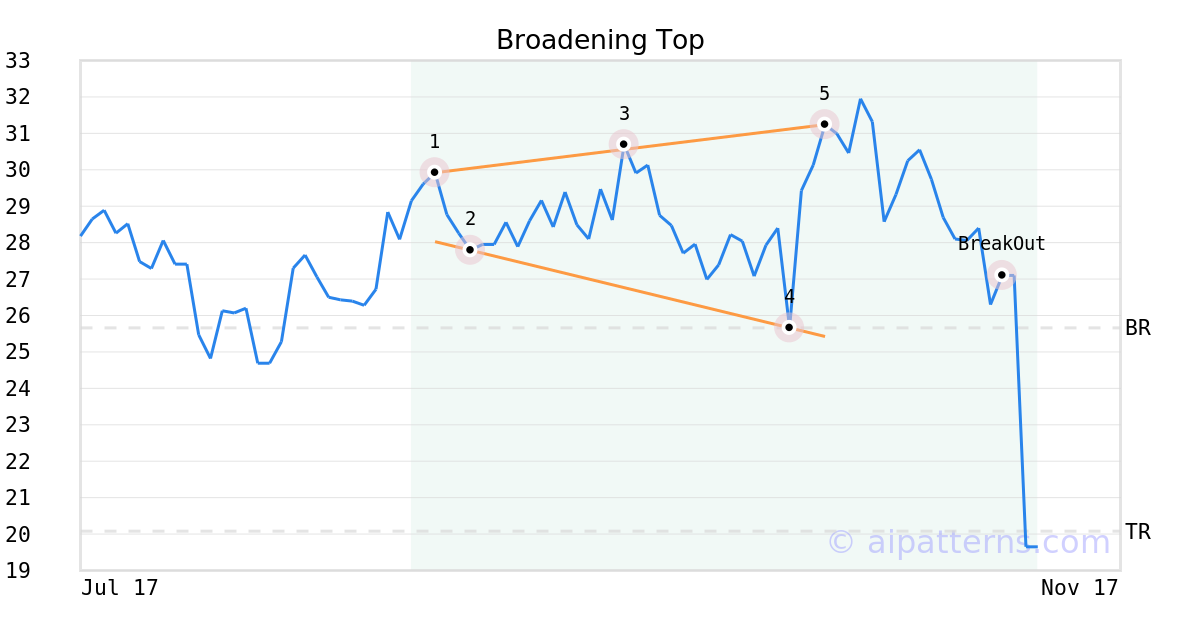On October 15, 2025, A.I.dvisor detected a Broadening Top Pattern (Bearish) for Alpha and Omega Semiconductor Limited (AOSL, $31.24). 21 days later, on November 05, 2025, A.I.dvisor confirmed the Bearish pattern, setting a target price of the stock. On November 05, 2025, the stock hit the target price of $20.08 – resulting in a +1 gain for traders who shorted the stock on the pattern detection date.