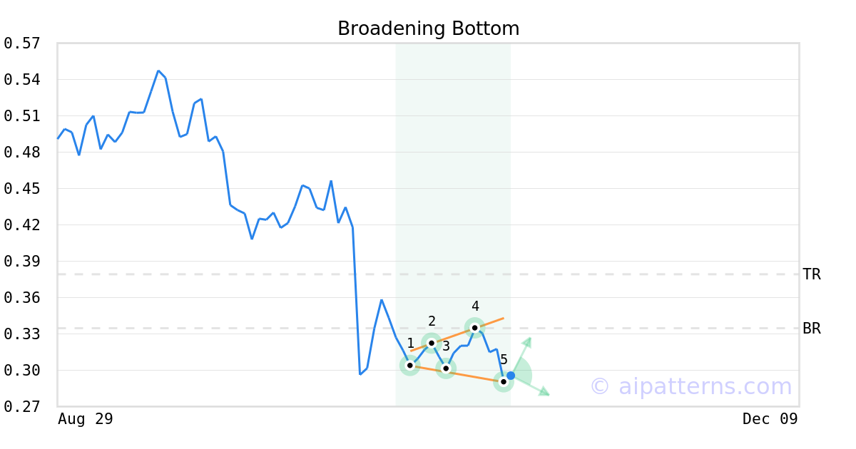 The Broadening Bottom pattern is formed when the price of a security progressively makes higher highs (2, 4) and lower lows (1, 3, 5) following two widening trend lines.