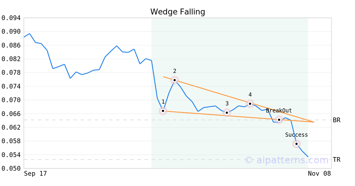 On October 31, 2025, A.I.dvisor detected a Wedge Falling Pattern (Bearish) for Ardor cryptocurrency (ARDR.X, $0.063790). On October 31, 2025, A.I.dvisor confirmed the Bearish pattern, setting a target price of the stock. On November 03, 2025, the stock hit the target price of $0.052600 – resulting in a +1 gain for traders who shorted the stock on the pattern detection date.